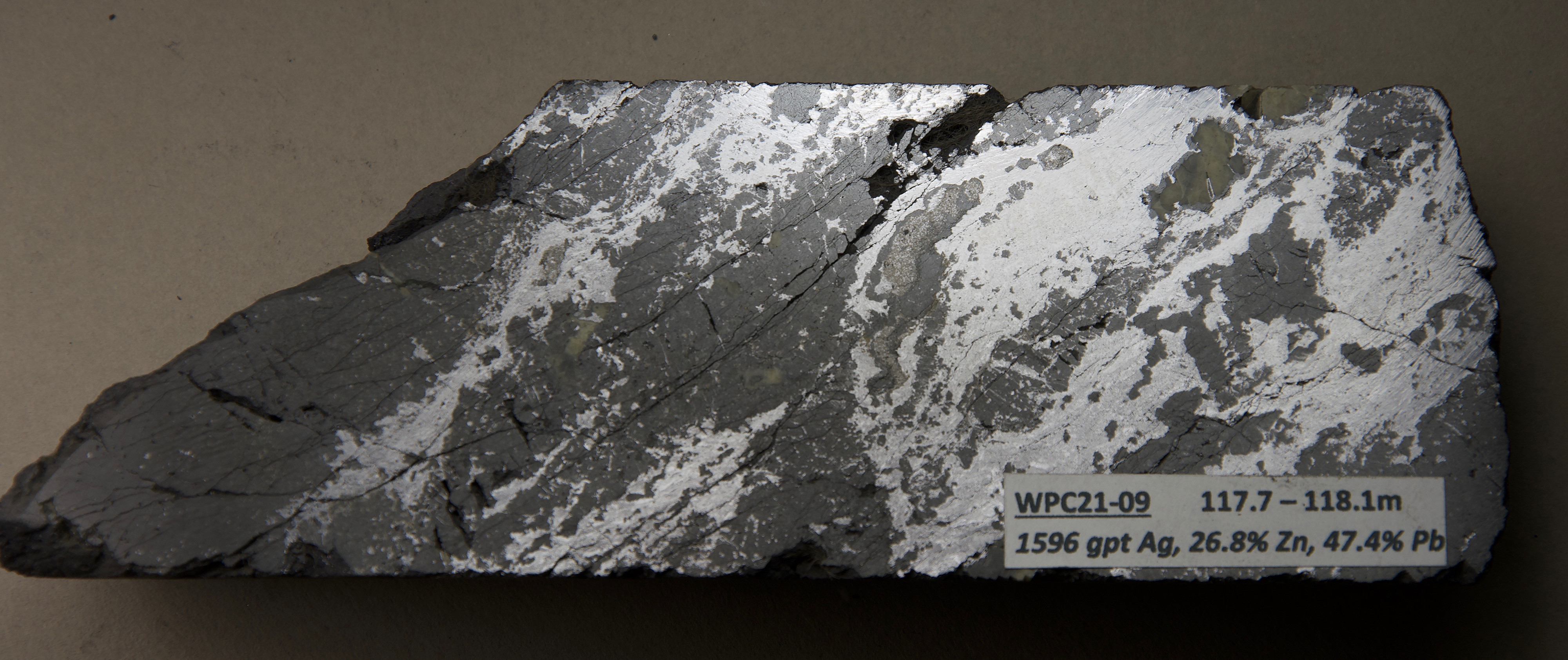 Drill core from IC24-0012 shows coarse-grained red sphalerite in the recrystalline ankerite stage with galena