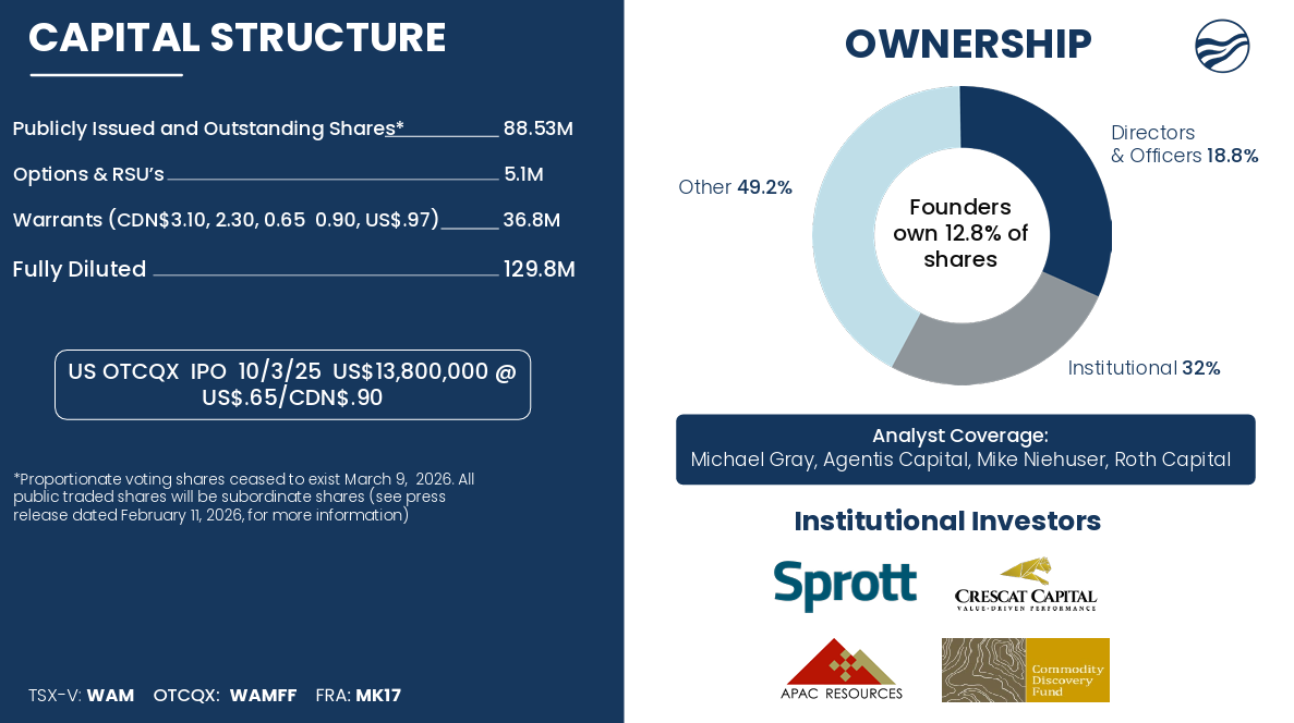 In 2021, Western Alaska Copper & Gold, a private Alaska-registered corporation, entered into a business combination agreement with a British Columbia numbered company to complete a Reverse Takeover (“RTO”) by way of a plan of merger. In connection with the RTO, in October 2021, the company completed a concurrent C$5.2M financing and applied to the TSX.V to list its common shares of the resulting issuer, Alaska Silver (WAM), as a Tier 1 Mining Issuer. The RTO was completed in November 2021 and trading began on the Exchange under the symbol “WAM” on November 15, 2021. Western Alaska Minerals changed its name to Alaska Silver on April 28, 2025 while keeping its trading symbol as WAM on the TSX-V.