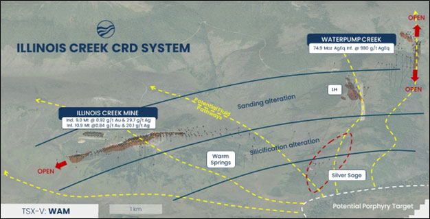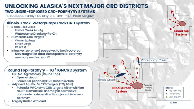 In addition to the planned drilling at Waterpump Creek and Silver Sage, Alaska Silver will advance a regional exploration initiative during the 2026 field season, reflecting the Company’s evolving interpretation of the Illinois Creek district as having two carbonate replacement deposit–porphyry (“CRD–PPY”) centers. with significant CRD potential developed within reactive carbonate stratigraphy surrounding each center. The first center (or “hub”) is the well-established Illinois Creek system, where multiple components of a large CRD system have been identified, including the Waterpump Creek-Pb-Zn resource, the Illinois Creek Au-Ag resource, Silver Sage, Warm Springs, and other prospects. While the intrusive center responsible for mineralization at Illinois Creek has not yet been located, the geological, structural, geophysical and geochemical evidence strongly supports its presence at depth. 2026 will see continued exploration for CRD mineralization in the Illinois Creek system to connect the dots along this major 8-km long mineralization corridor.