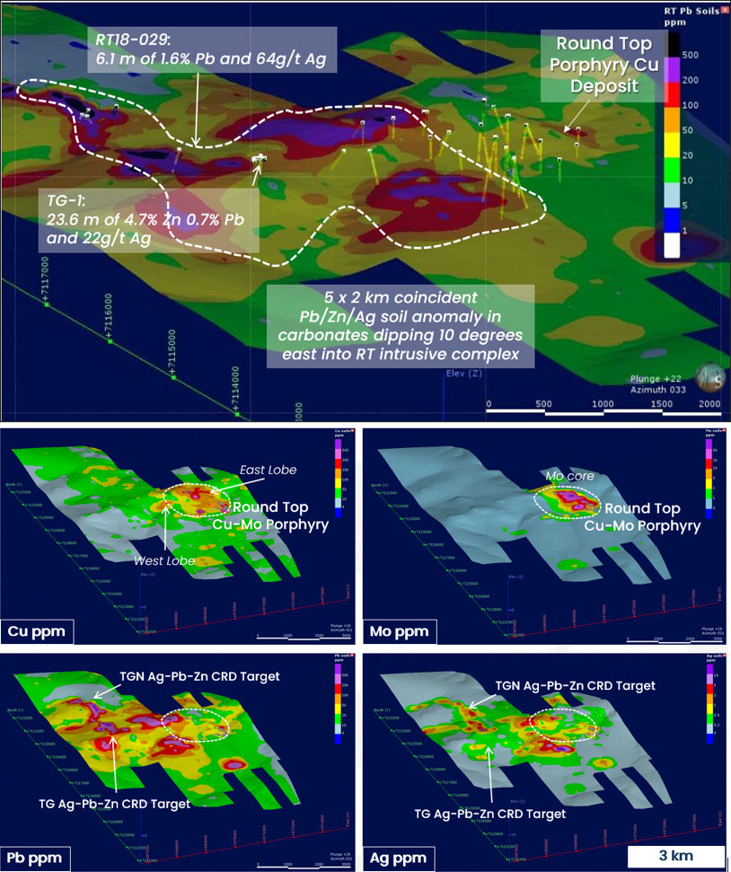 The second hub is centered on the Round Top Ag-Cu-Mo porphyry, located approximately 20 km from the Illinois Creek system. In contrast to Illinois Creek, the Round Top system exposes a well-defined mineralized intrusive porphyry center surrounded by extensive carbonate host rocks that exhibit strong, widespread geochemical leakage to surface, including highly anomalous silver, lead, and zinc values over multi-kilometer strike lengths.
