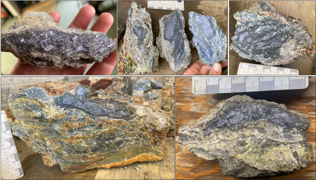 Figure 1: Hand sample photographs of rocks from T45 “The Galena Trench” showing feathery galena and cerussite with silicification.