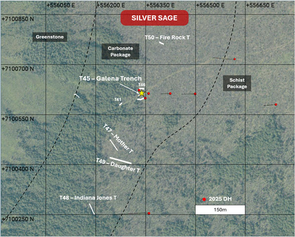 - Additional trenches (T44, T46, T47, T49, and T50) returned highly elevated metal values, indicating broader mineralized continuity within the Silver Sage zone with widespread alteration, multiple mineralized horizons, and complex structural repetition (Figure 4).